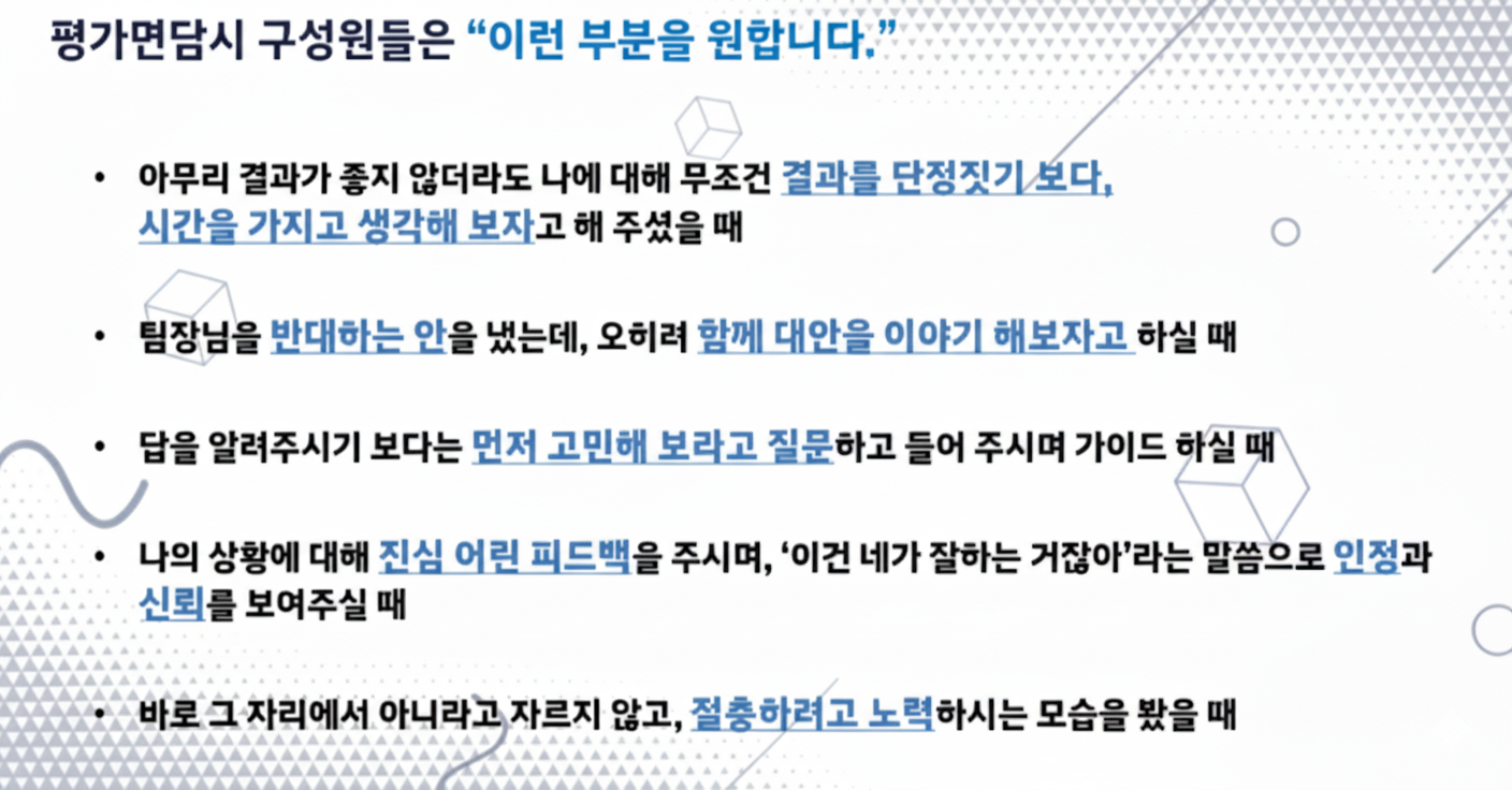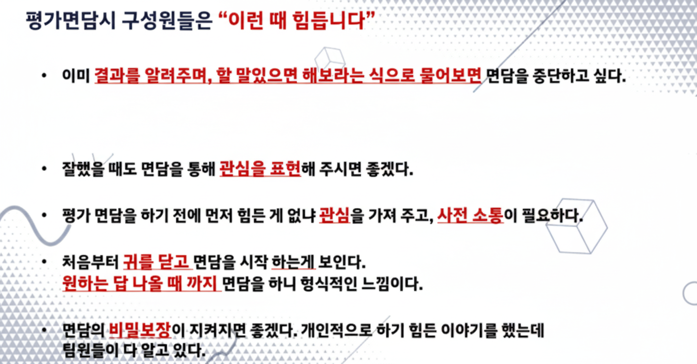 평가 면담에서 중요한 부분 3가지를 말씀드립니다.