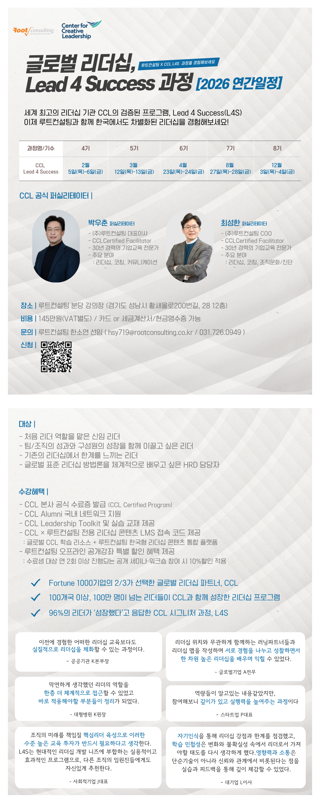 Lead 4 Success(L4S) 차별화된 리더십을 오직 루트컨설팅에서만 경험할 수 있습니다!